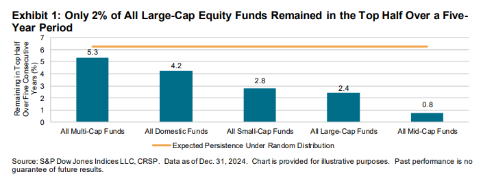 Round 2% of all massive cap funds had been capable of stay within the prime half of returns for his or her class in 5 straight years. It will get even worse the additional out you go.