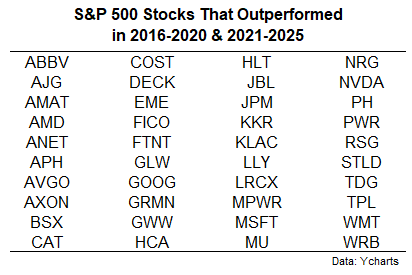 Might you speak about what share of shares which can be beating the S&P over the past 5 years additionally beat the S&P the 5 years earlier than that? I’m curious what names seem in each lists, with components like pre- and post-COVID, and pre- and post-AI enjoying an element. Possibly you possibly can additionally speak about how shares that beat the S&P over a 5-year window are likely to fare over the following 5 years on common.