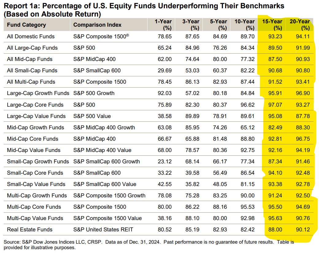 Over 15 and 20 years simply 10% or so of all actively managed funds outperform.